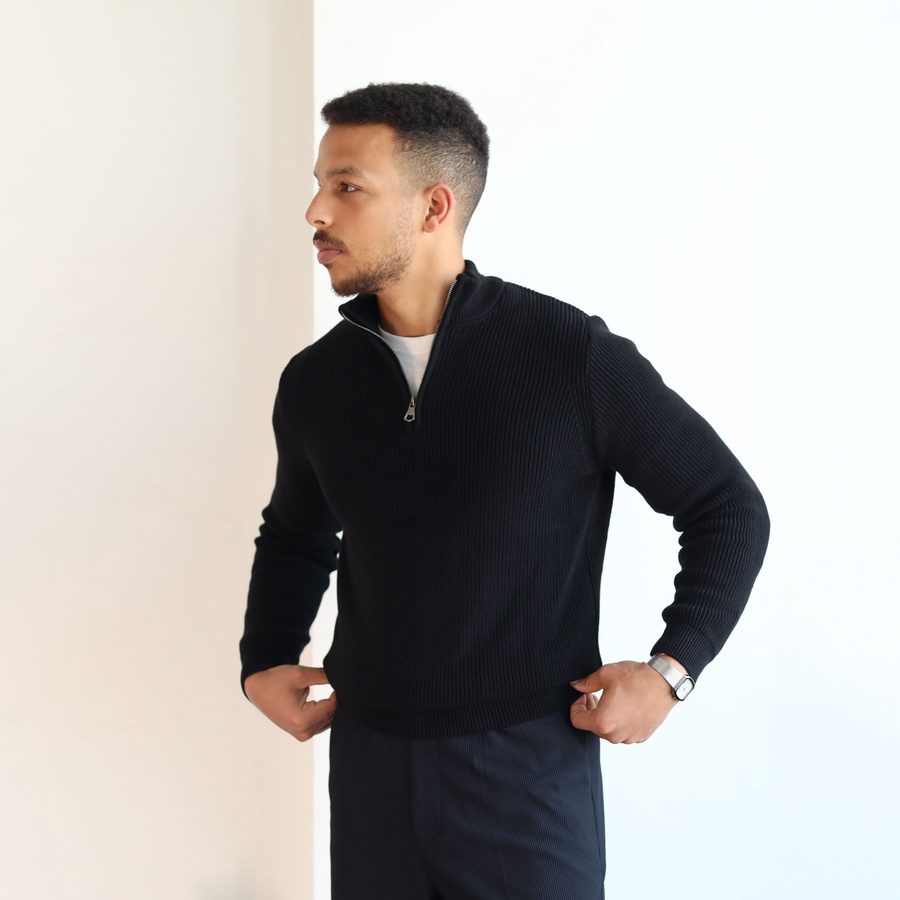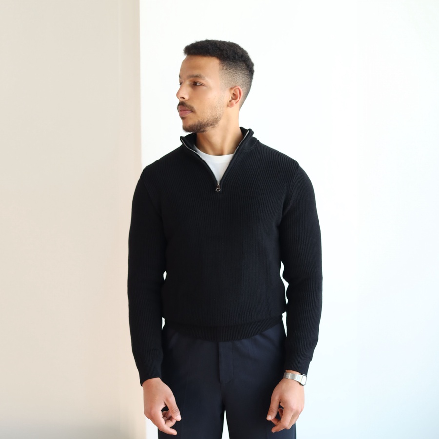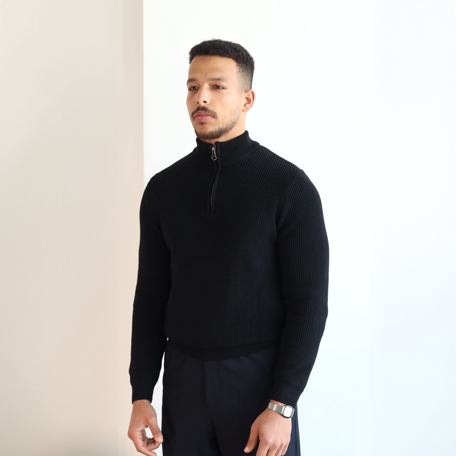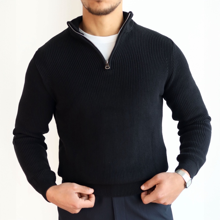 Elevate your everyday style with our Ribbed Quarter Zip Knit Sweater, crafted from a soft cotton-acrylic blend for warmth and comfort.