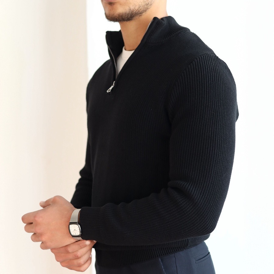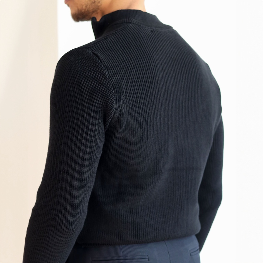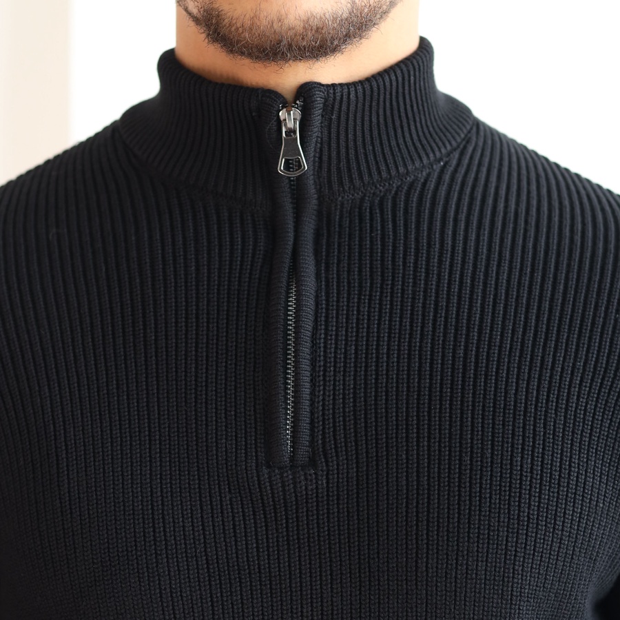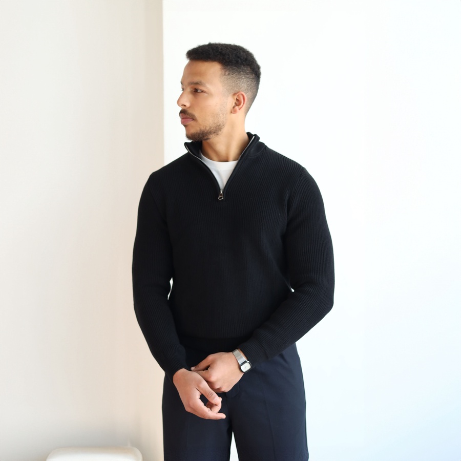 Elevate your everyday style with our Ribbed Quarter Zip Knit Sweater, crafted from a soft cotton-acrylic blend for warmth and comfort.