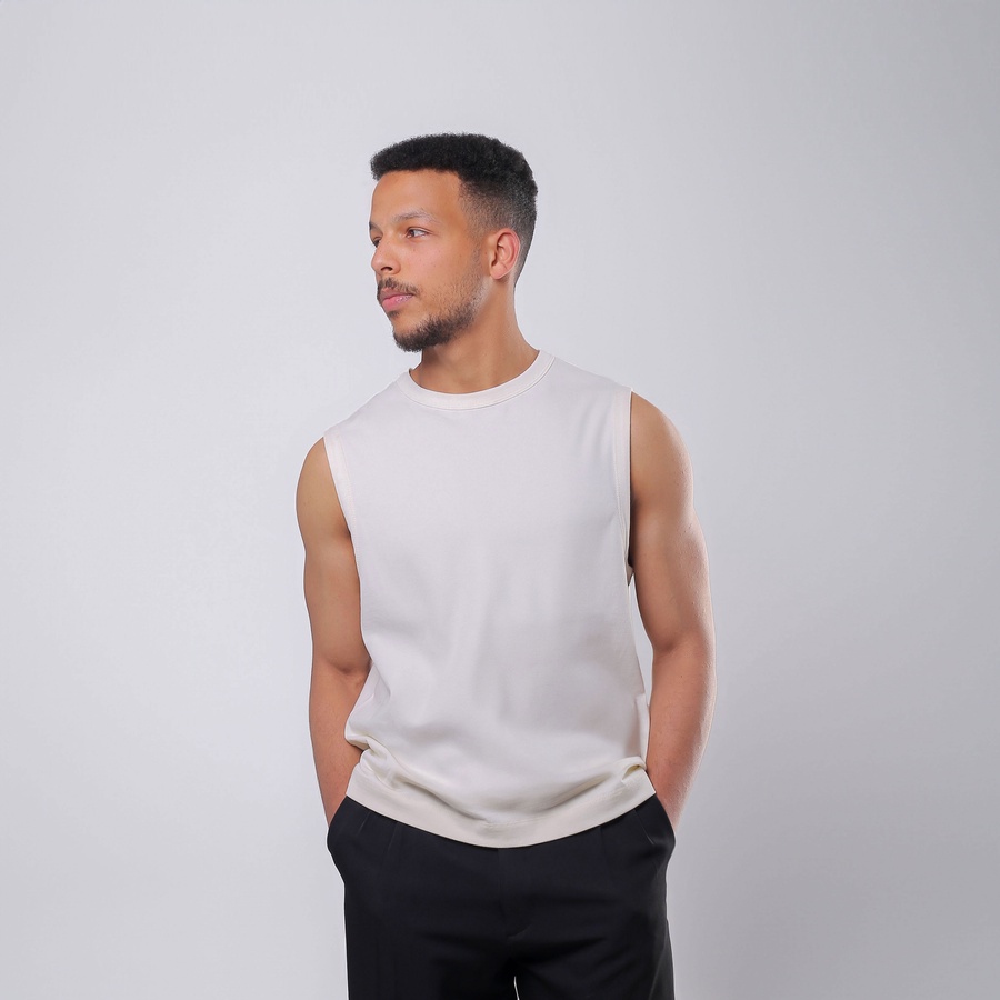 This sleeveless cotton tee is your go-to piece for a minimal smart look or a chill summer vibe. Made from soft, breathable cotton with a relaxed fit that sits just right – not too tight, not too loose.