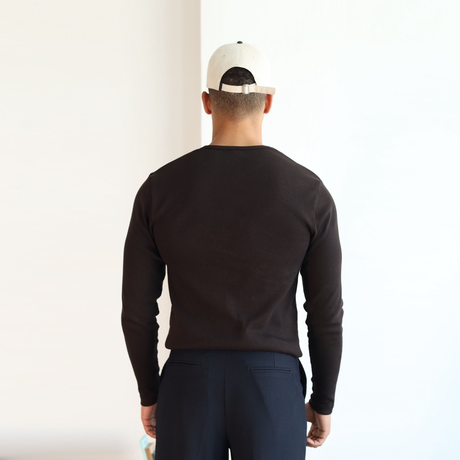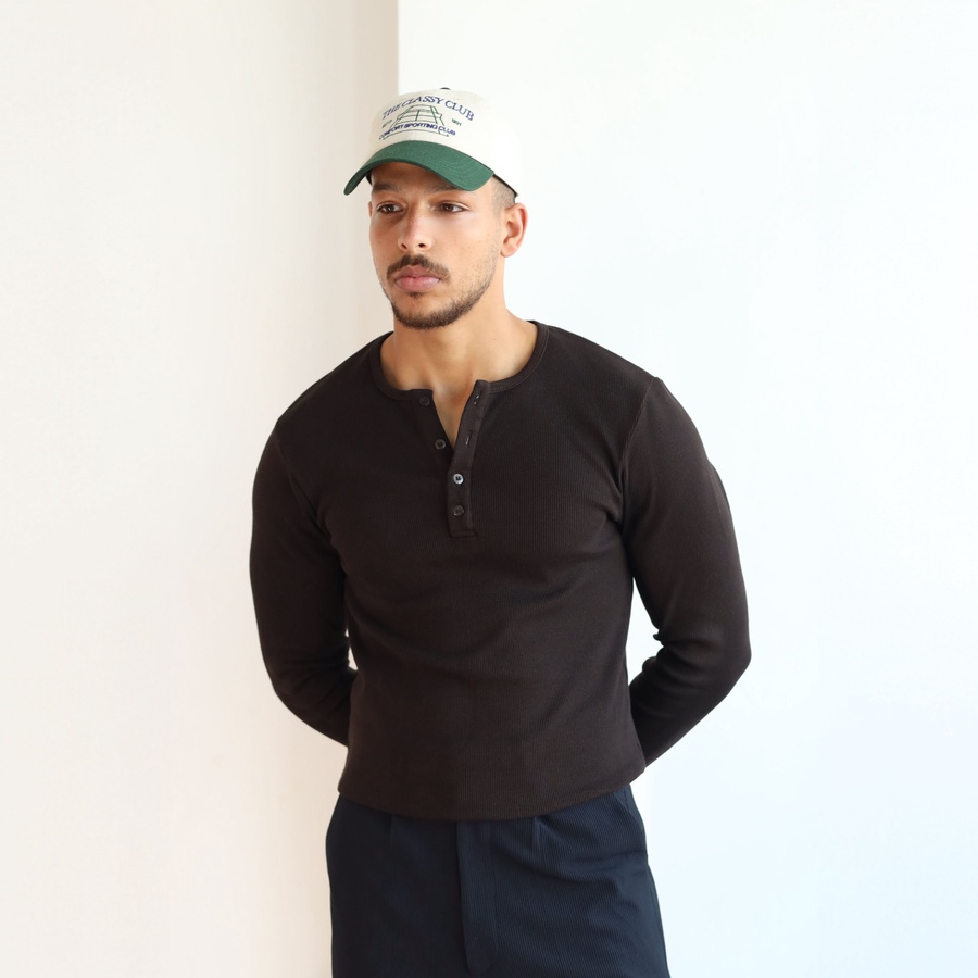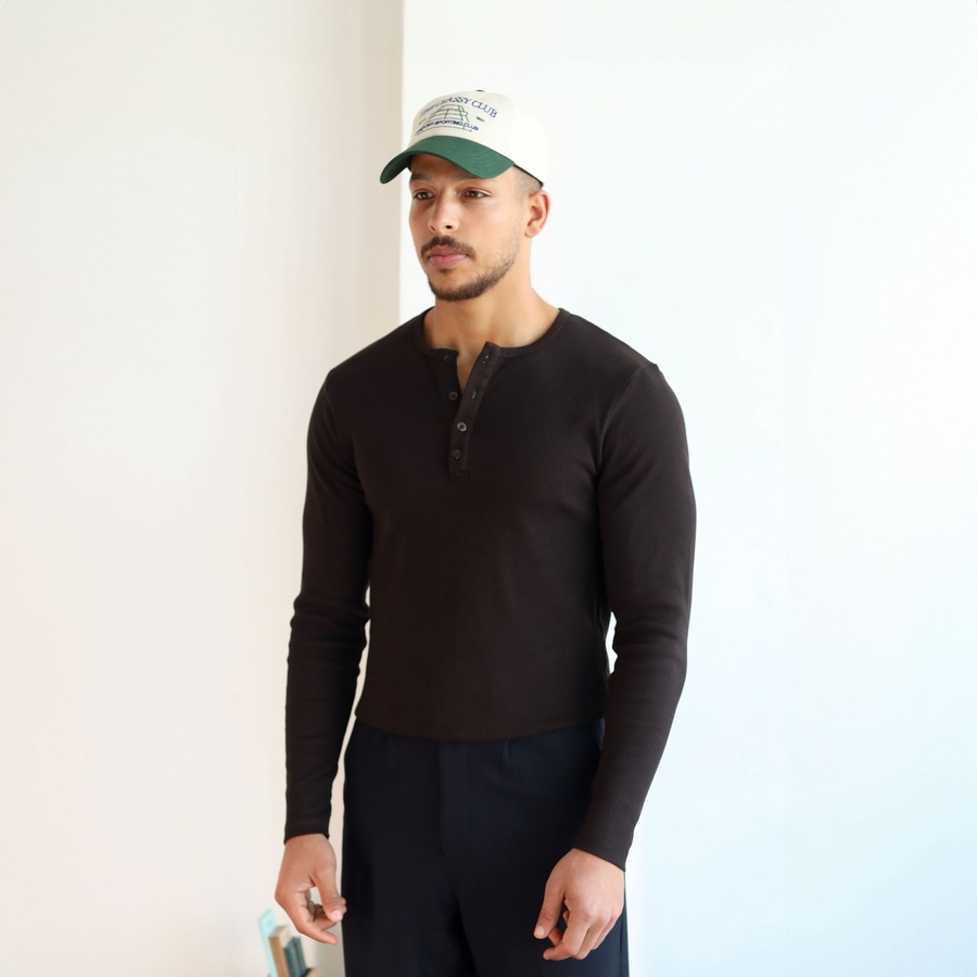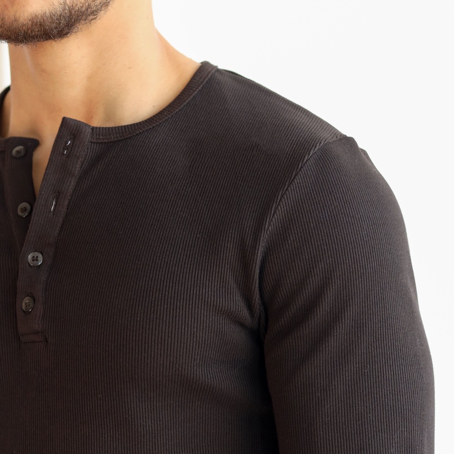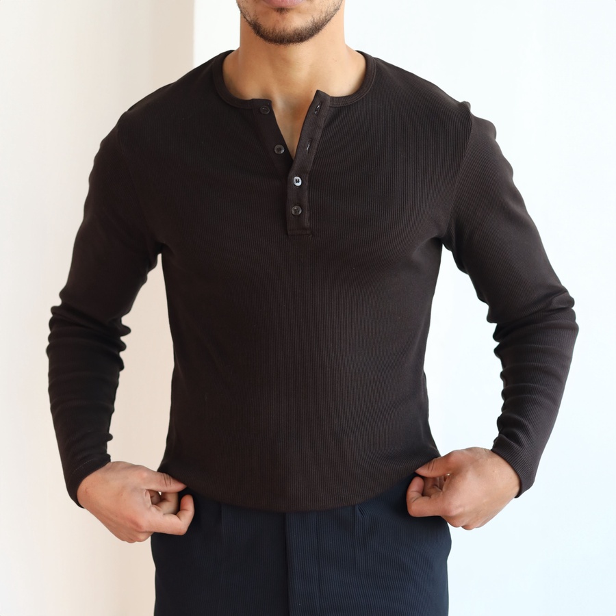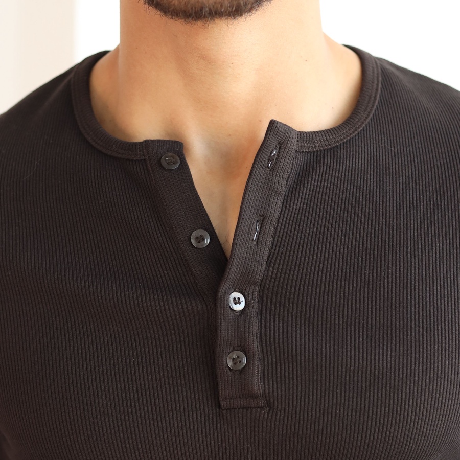 Classic 3-Button Henley Neck, Long Sleeves, Breathable Ribbed Texture