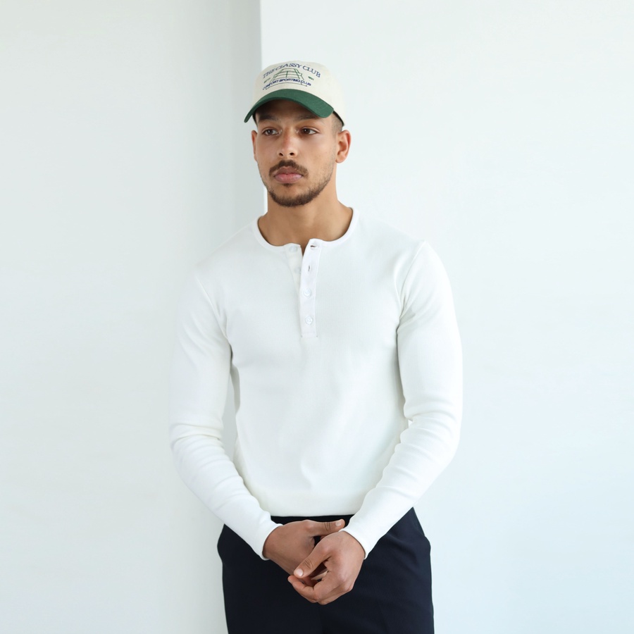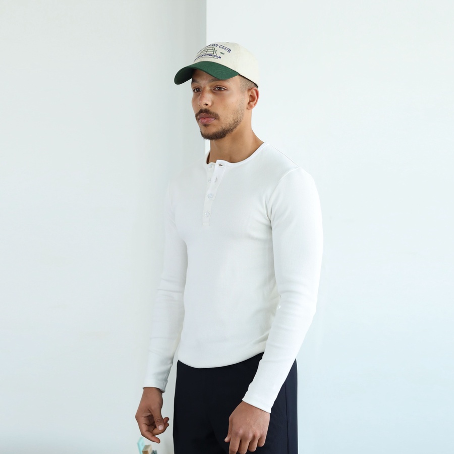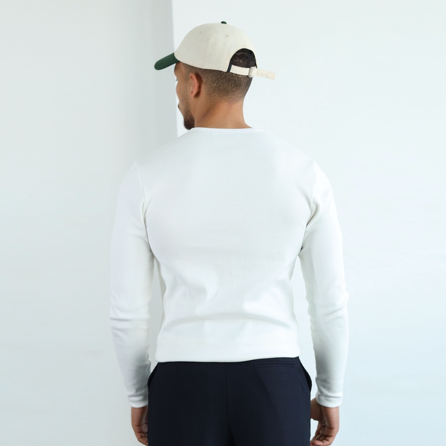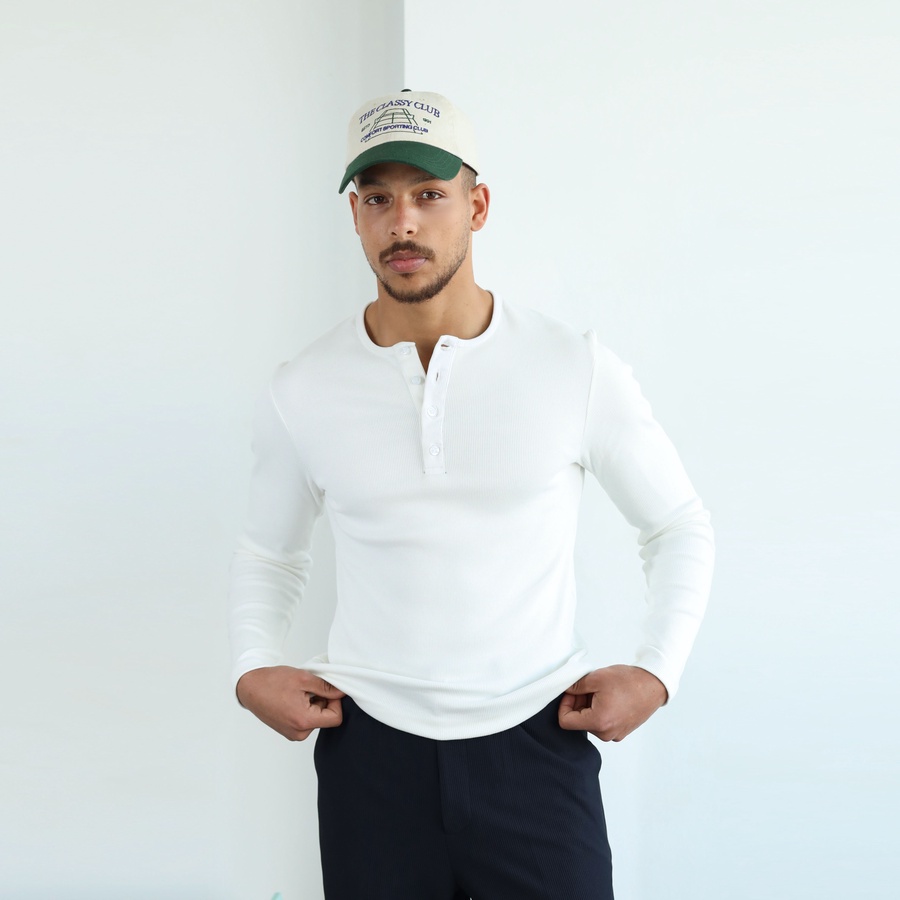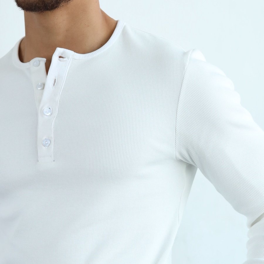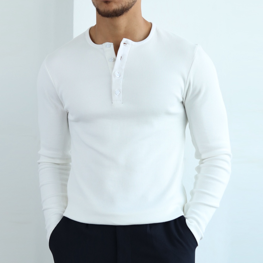 Classic 3-Button Henley Neck, Long Sleeves, Breathable Ribbed Texture